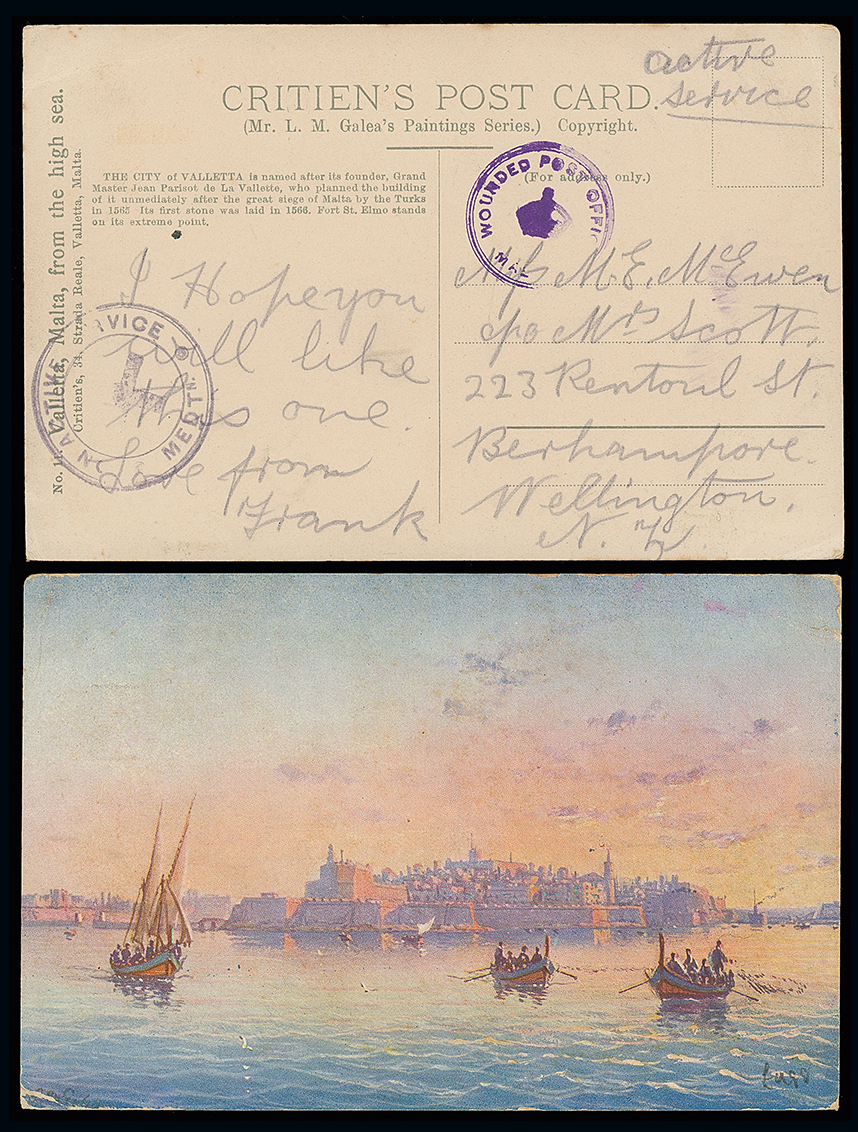 1753 c, entire, etc. imageMalta: World War I: Hospitals, 1915 picture postcard to New Zealand endorsed “Active Service” with rare violet double ring “WOUNDED POST OFFICE/(crown)/MALTA.” mark and a grey-blue double ring “ON ACTIVE SERVICE MEDT.” mark (OAS-6g) applied at St Andrew’s Hospital. Photo. (Image1)
