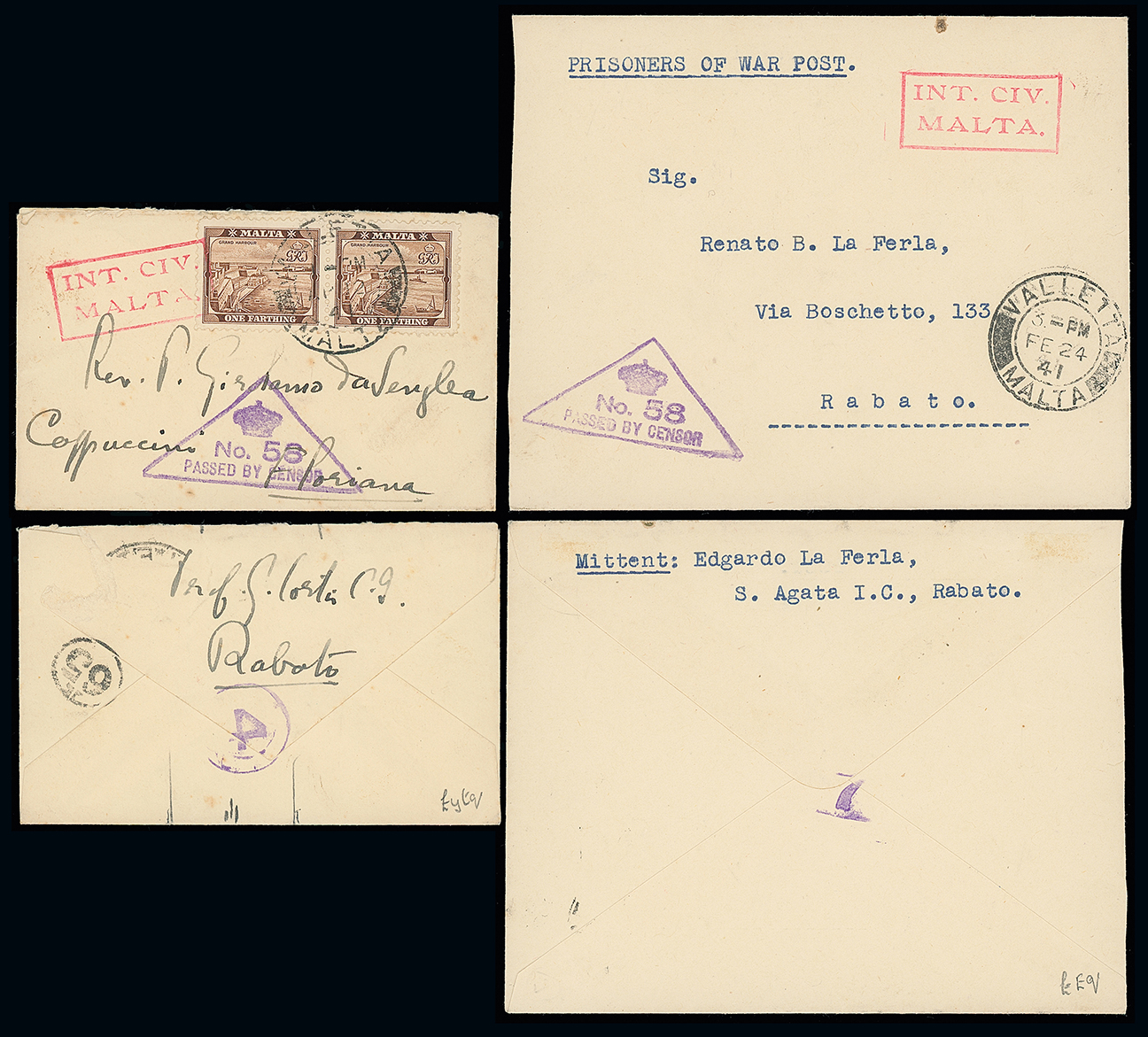 1763 c, entire, etc. imageMalta: World War II Civilian Internees: Convent of St Agatha (Rabat): 1941 (Feb. 24) envelope to Rabat endorsed “PRISONERS OF WAR POST.” with framed “INT.CIV./MALTA” with Valletta c.d.s. and triangular “No. 58” censor mark and from Edgardo La Ferla, to his wife and deported the following year to Uganda and 1941 (Apr. 12) small envelope to Floriana franked 1/4d. pair tied by a c.d.s. and framed “INT.CIV./MALTA” mark in red and with triangular “No. 58” censor mark. (2 items) From Professor Giulio Cortis (Royal Malta University) also deported to Uganda the following year. Photo. (Image1)