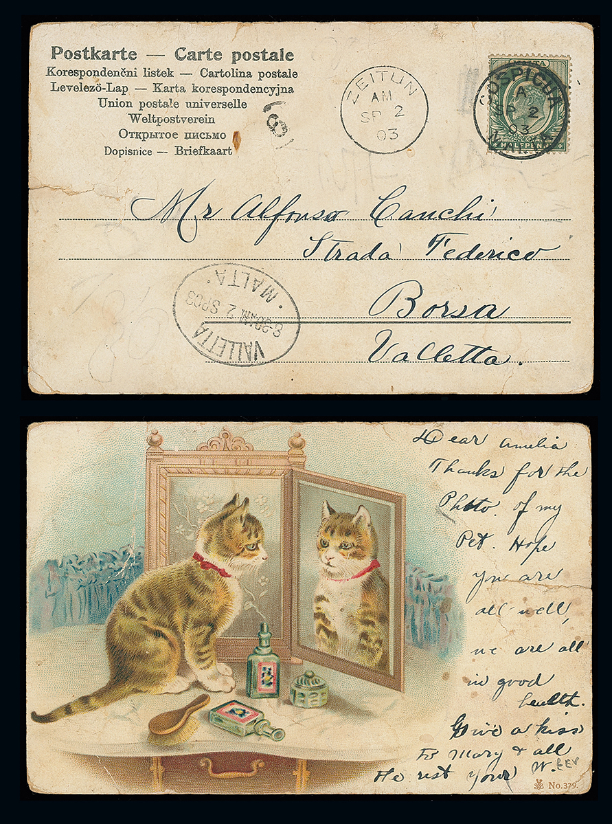 1744 c, entire, etc. imageMalta: Village Cancellations: Malta: Zeitun: 1903 (Sept. 2) picture postcard (small faults) to Valletta franked 1/2d. tied by “ZEITUN/AM” c.d.s., with additional strike at left and an oval Valletta datestamp at lower left. Ex Eastgate. (2 items) Photo. (Image1)