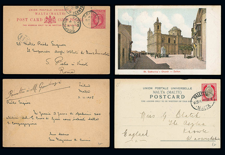 1745 c, entire, etc. imageMalta: Village Cancellations: Malta: Zeitun: 1908 (Nov. 5) 1d. postcard to Rome with “ZEITUN/AM” c.d.s. and Cospicua transit and part Rome arrival c.d.s., also a picture postcard of St Catherine’s Church in Zeitun. (2) (Image1)