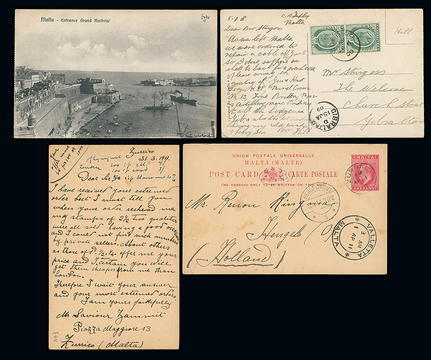1746 c, entire, etc. imageMalta: Village Cancellations: Malta: Zurrico: 1909 (Jan. 6) picture postcard to Gibraltar franked 1/2d. pair tied by “ZURRICO/AM” c.d.s. and 1911 (Apr. 1) K.E.VII 1d. postcard to Holland with “ZURRICO/AM” c.d.s. and Valletta transit double ring c.d.s., fine. (2 items) Photo. (Image1)