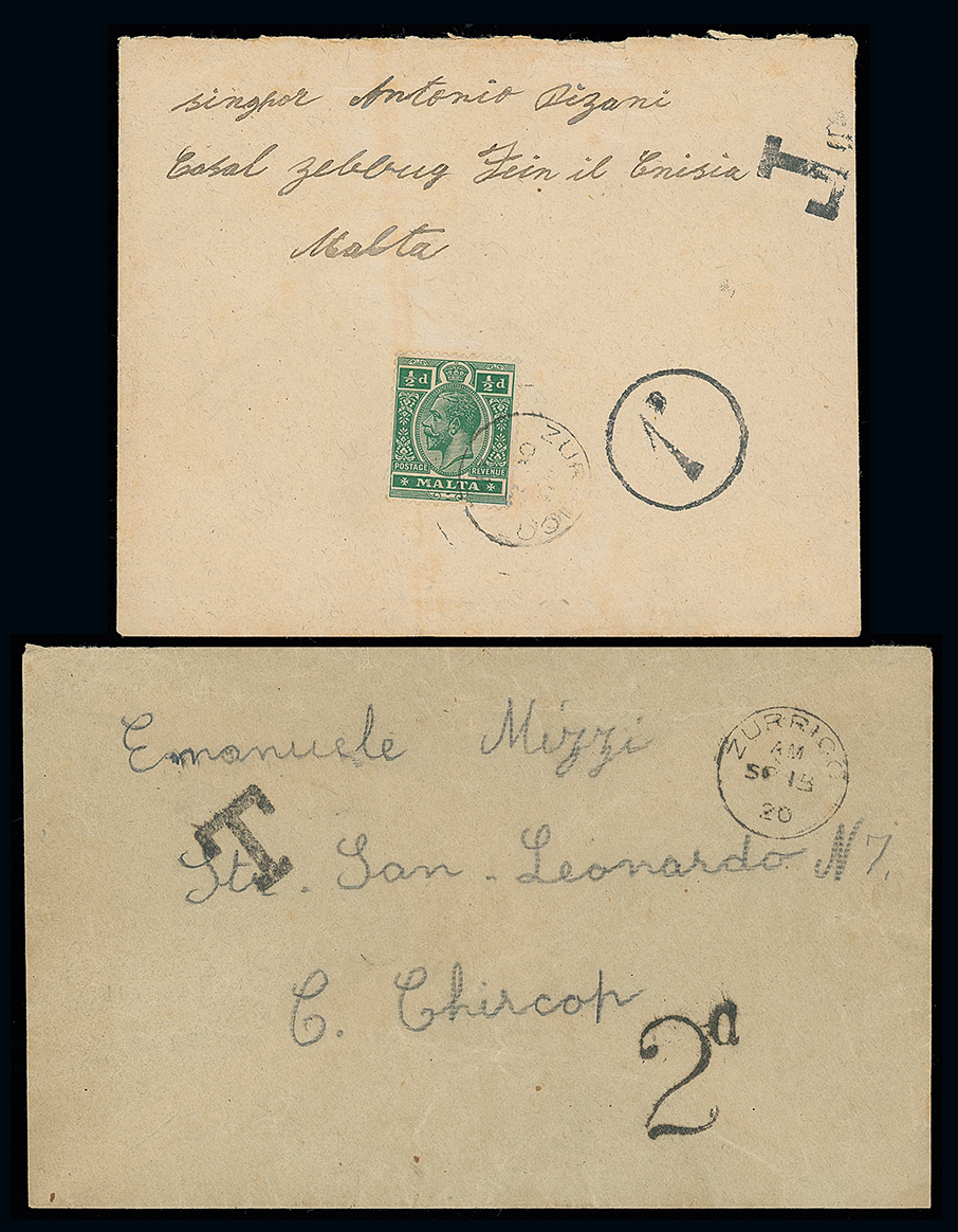 1747 c, entire, etc. imageMalta: Village Cancellations: Malta: Zurrico: 1920 (Sept. 13) envelope to Chircop sent unpaid with “ZURRICO/AM” c.d.s., bold serif “T” and “2d” marks in black and 1921 (Oct.) envelope to Zebbug franked 1/2d. tied by “ZURRICO/AM” c.d.s. and with bold serif “T” and circular “1D” marks in black, rare use of postage due marks on village mail. (2) Photo. (Image1)