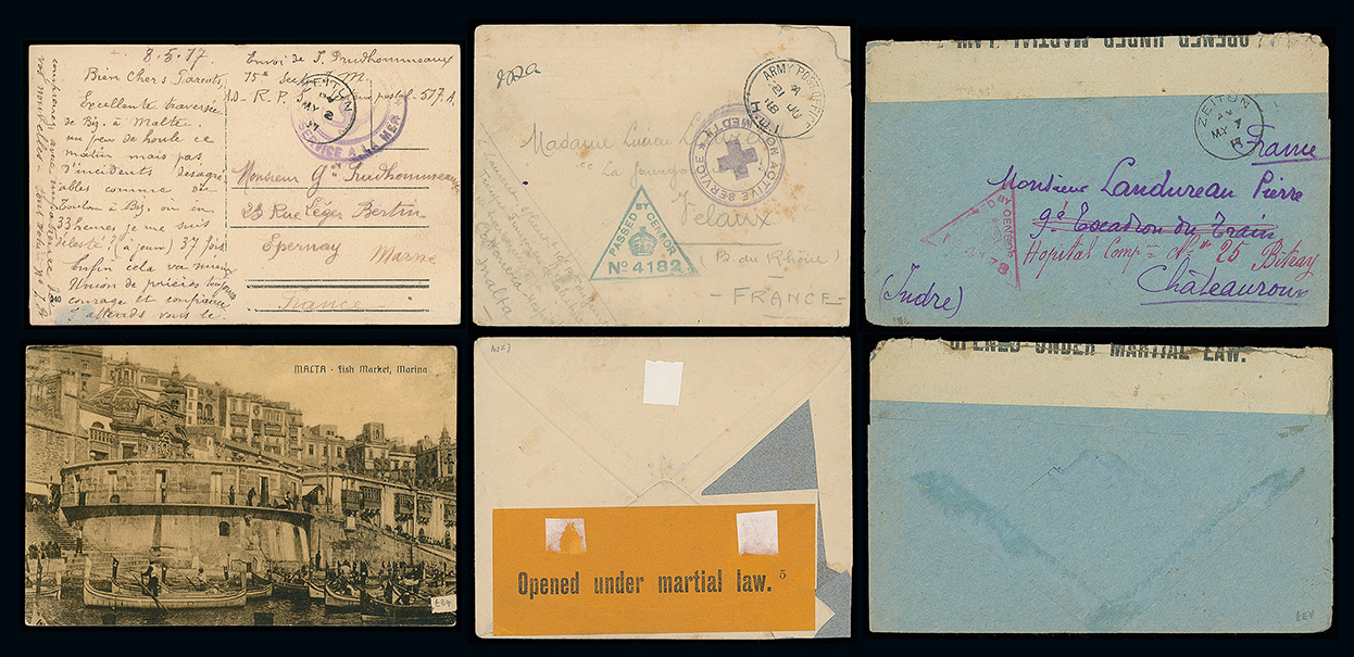 1748 Used imageMalta: World War I: French Navy at Malta: A stampless selection to France, comprising 1917 cover with “OPENED UNDER MARTIAL LAW” tape, Zeitun c.d.s. and triangular “4178” censor mark, 1917 postcard with Zeitun c.d.s. and violet “MARINE FRANCAISE SERVICE A LA MER” cachet (ex Eastgate) and 1918 cover with “ARMY POST OFFICE/H.D.1” c.d.s., “ON ACTIVE SERVICE/MEDTn.” cross cachet and triangular “No 4182” censor mark, endorsed by a sub-lieutenant in the 19th Regiment whilst at Corradino Hospital. (3) Photo. (Image1)