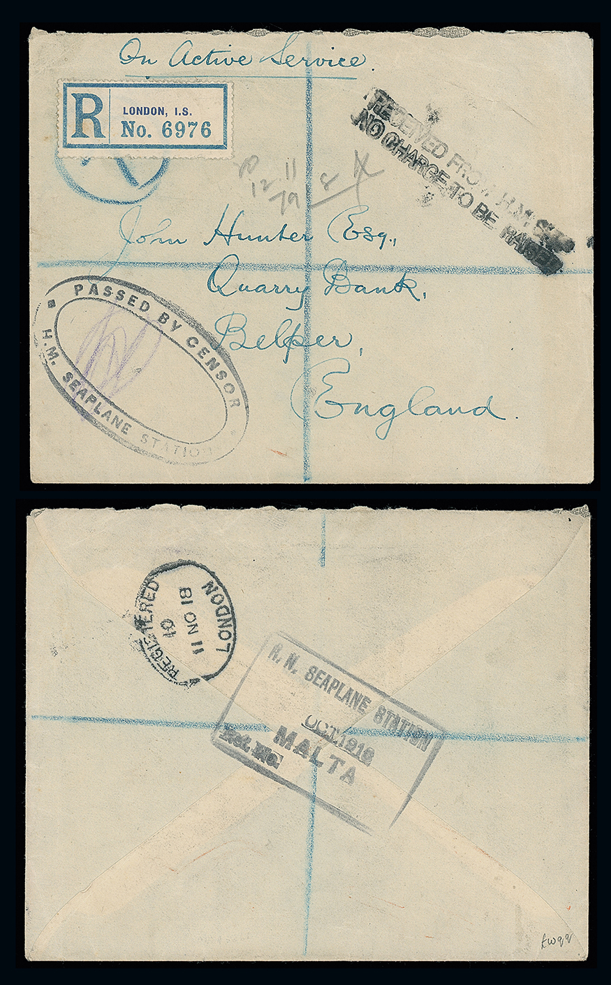 1750 imageMalta: World War I: 1918 (Oct.) envelope “On Active Service” to England with double oval “PASSED BY CENSOR/H.M.SEAPLANE STATION” mark and framed “R.N.SEAPLANE STATION/(date)MALTA/Ref No.” datestamp on the reverse with manuscript blue cross and circular “R” mark and printed “LONDON I.S.” (Inland Section) registration label affixed and “RECEIVED FROM HM SHIP/NO CHARGE TO BE RAISED” mark, very unusual. Photo. (Image1)