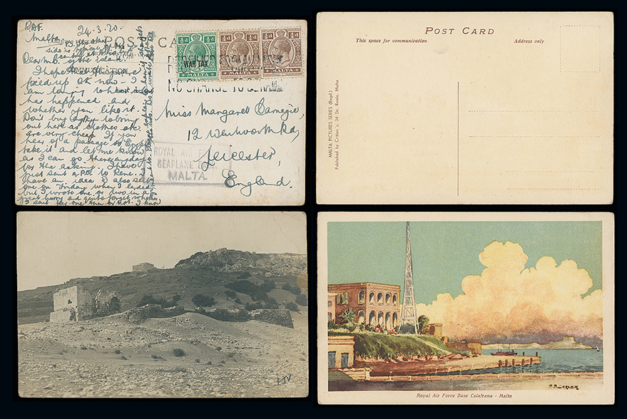 1751 c, entire, etc. imageMalta: World War I: 1920 (Mar. 24) picture postcard to Leicester franked 1/4d. (2) and 1/2d. ‘WAR TAX’ tied by “RECEIVED FROM HM SHIPS/NO CHARGE TO BE RAISED” mark and with framed “ROYAL AIR FORCE/SEAPLANE BASE/MALTA” mark also a picture postcard depicting the base. (2 items) Photo. (Image1)