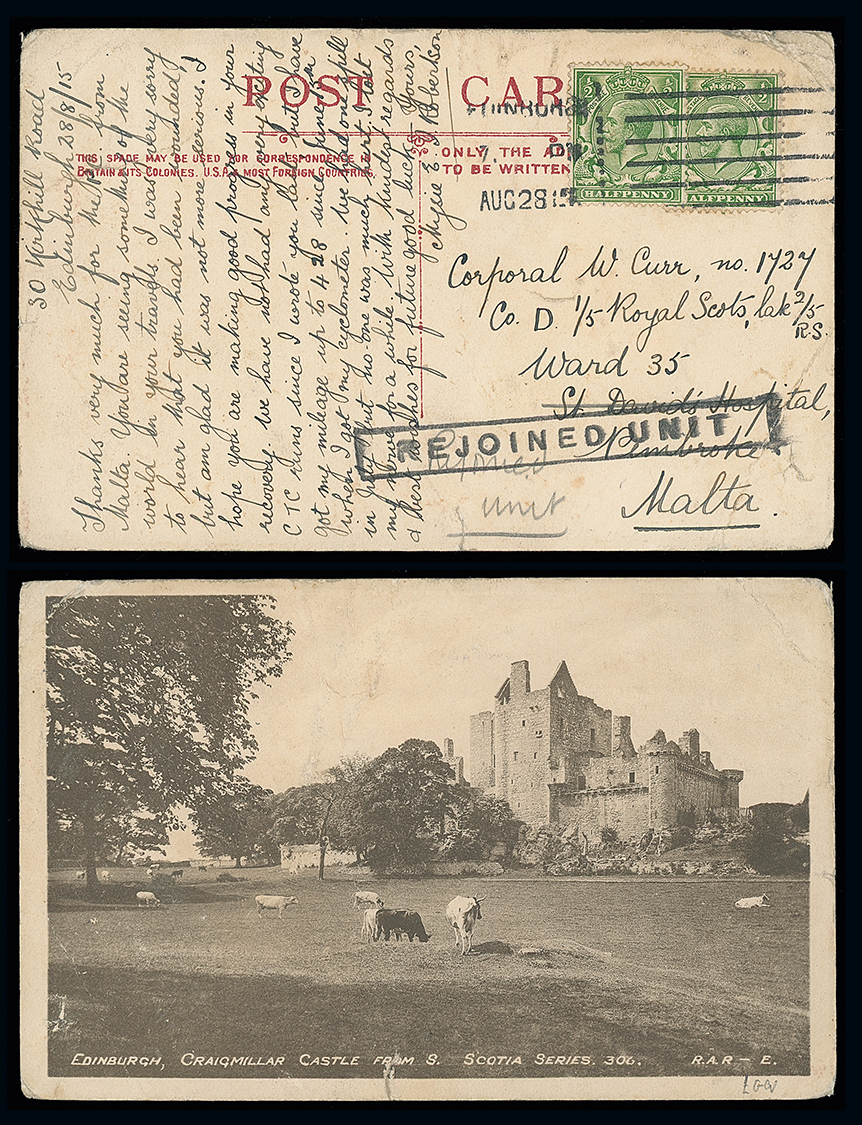 1754 c, entire, etc. imageMalta: World War I: Hospitals: 1915 (Aug. 28) picture postcard to a corporal at St David’s Hospital franked G.B. 1/2d. (2) tied by Edinburgh machine cancellation and with scarce framed “REJOINED UNIT” mark. Photo. (Image1)