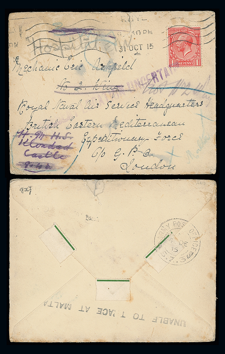 1755 c, entire, etc. imageMalta: World War I: Hospitals: 1915 (Oct. 31) envelope to the Mediterranean Expeditionary Force franked G.B. 1d. tied by Rhyl machine cancellation with A.P.O “S.Z.3” (Imbros) c.d.s., endorsed “Not No. 2 Wing”, redirected to HM Ship “Klonad Castle” then Malta and endorsed “Hospital” with straight line “UNABLE TO TRACE AT MALTA” (on the reverse) and straight line “PRESENT LOCATION UNCERTAIN” marks, dramatic cover. Photo. (Image1)