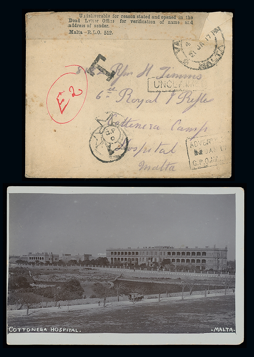 1756 c, entire, etc. imageMalta: World War I: Hospitals: 1917 (Jan. 21) local envelope to Cottonera Camp Hospital from Valletta, sent unpaid with bold serif “T”, circular “1D.”, framed “UNCLAIMED”, framed “ADVERTISED/(date)/G.P.O. MALTA” and with Dead Letter Office printed reseal tape at top and returned to sender, also real-photographic postcard of the Hospital. (2) Photo. (Image1)