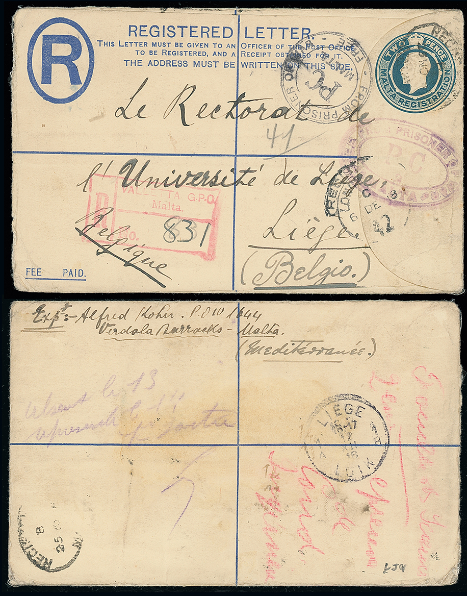 1758 c, entire, etc. imageMalta: World War I: P.O.W Mail: 1918 (Nov. 25) 2d. registration envelope (size G, use permitted after the war ended) to Liege from an Alfred Kohn (Austrian National) at Verdala Camp with framed Valletta registration mark, double ring “FREE FROM PRISONER OF WAR*MALTA*PC/MALTA” in black and double oval “FREE FROM PRISONER OF WAR/P.C./1/MALTA” cachet in violet and a London hooded transit datestamp, scarce. Photo. (Image1)