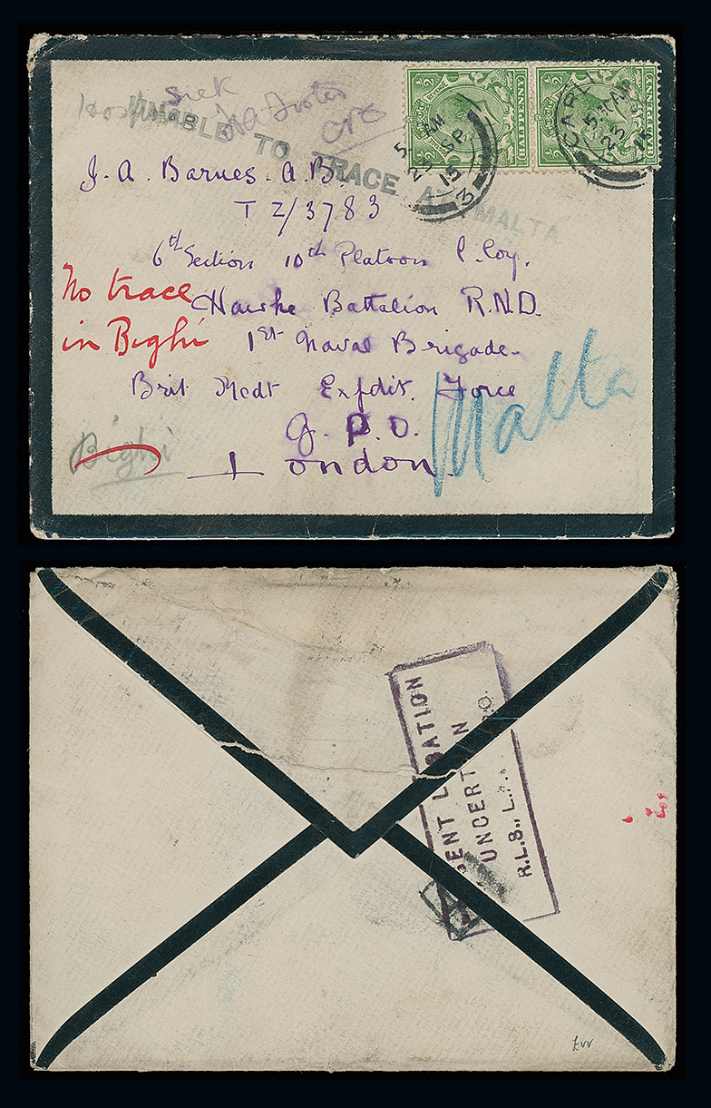 1759 c, entire, etc. imageMalta: World War I: A collection of covers and postcards, incl. 1915 mourning envelope to the British Mediterranean Expeditionary Force (Hawke Battalion) franked G.B. ½d. pair with “UNABLE TO TRACE AT MALTA” mark and endorsed “Sick”, “Bighi” and “No trace/in Bighi (Hospital)” and framed “PRESENT LOCATION/UNCERTAIN” mark, 1915-16 ‘honour’ envelopes used to England, one franked Malta 1d. 1916 envelope “per (H.M.S.) Bacchante” to Malta with framed “CENSORED.” mark (Gould 5A 127 Lord Nelson), 1917 envelopes to Alexandria from Valletta or locally and to or from the Royal Malta Artillery in Alexandria, from 1918 censored envelope to Sicily franked ½d. ‘WAR TAX’ and 1d. tied by Valletta c.d.s. with Governor’s imprint on rear flap etc. (17) (Image1)