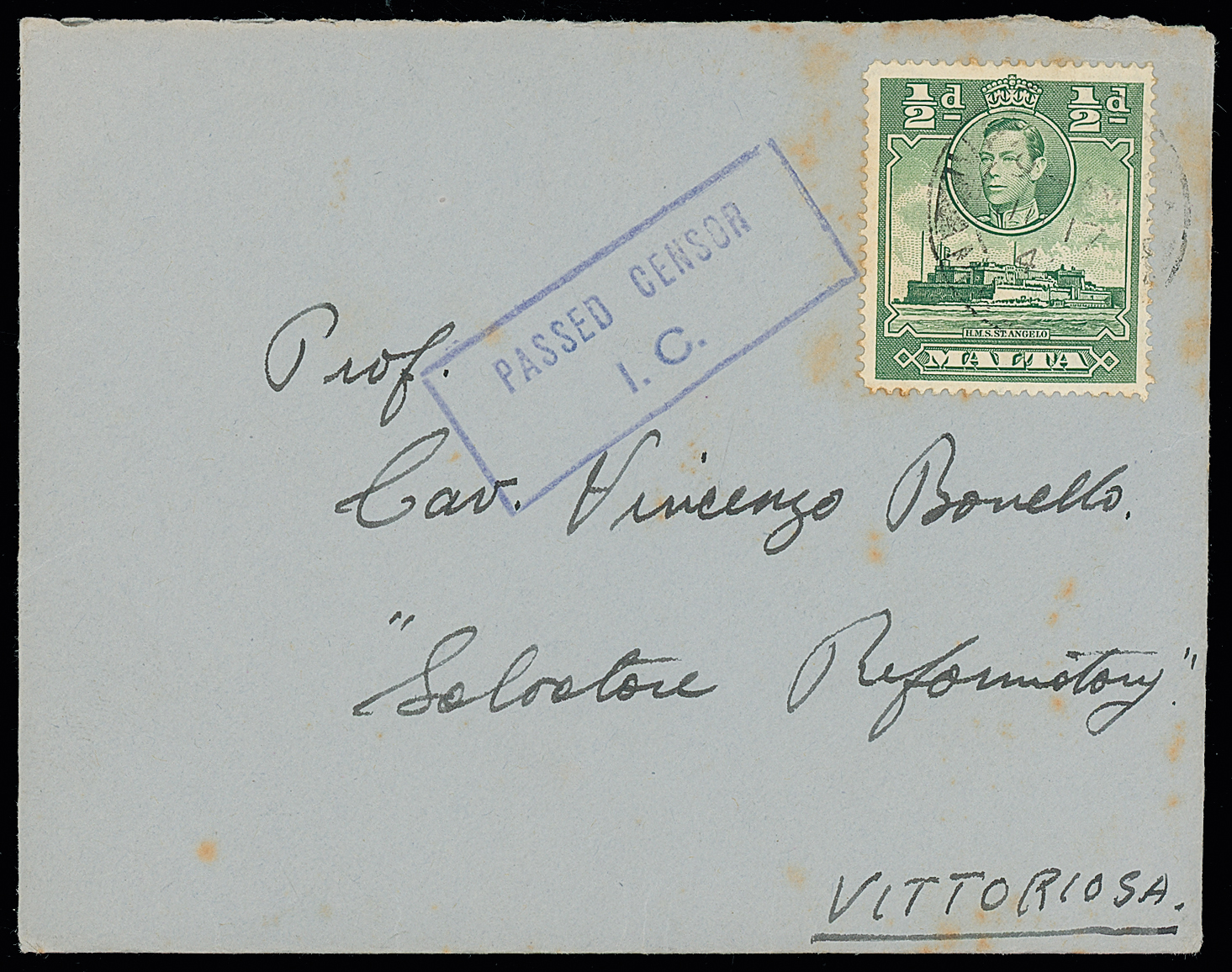 1760 c, entire, etc. imageMalta: World War II Civilian Internees: Fort San Salvatore Camp: 1940 (June 15) envelope to the “Salvatore Reformatory” (the Camp was a former school for juvenile delinquents) at Vittoriosa franked 1/2d. tied by Siggieui c.d.s. and with framed “PASSED CENSOR/I.C.” mark in blue. Note: The cover is addressed to Cavalier Vincenzo Bonello, Knight of the Sovereign Order of Malta and a writer, academic and former Director of the Art Museum. He was subsequently deported to Uganda in 1942. Photo. (Image1)