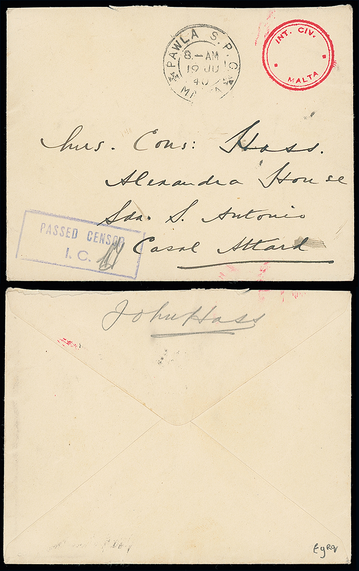 1761 c, entire, etc. imageMalta: World War II Civilian Internees: Fort San Salvatore Camp: 1940 (June 19) envelope to Attard with double ring “INT.CIV./MALTA” in red with “PAWLA S.P.O./MALTA” c.d.s. and framed “PASSED CENSOR/I.C.” mark. No charges raised. Note: From John Hass (interned the month prior), Accountant at the Royal Naval Arsenal, to his wife. Photo. (Image1)