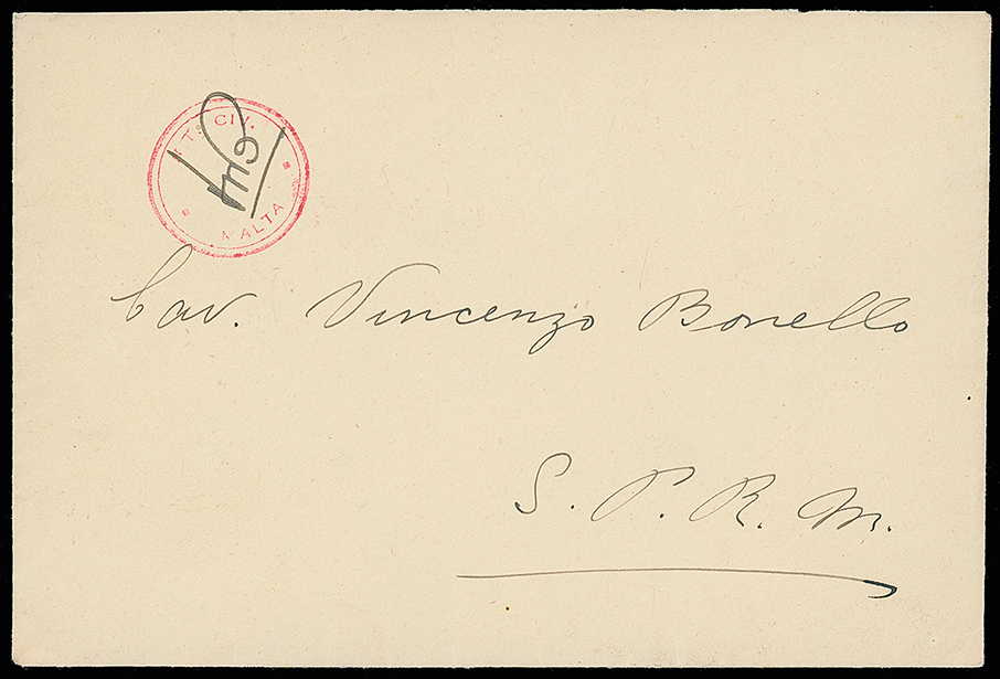 1762 c, entire, etc. imageMalta: World War II Civilian Internees: Fort San Salvatore Camp: 1940 (June ca.) envelope to the “S(alvatore) P(rison) R(eformatory) M(alta)” carried by hand from Rino Bonello, to her husband with double ring “INT.CIV./MALTA” mark in red. Note: The cover is addressed to Cavalier Vincenzo Bonello, Knight of the Sovereign Order of Malta and a writer, academic and former Director of the Art Museum. He was subsequently deported to Uganda in 1942. Ex Coates. Photo. (Image1)