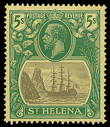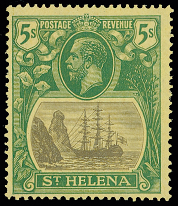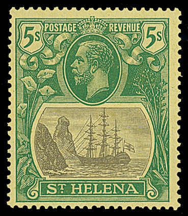 Saint Helena: 1922-37 Watermark Mult. Script CA 5s. grey and green on yellow variety ‘cleft rock’, unmounted mint, fine. S.G. 110c, cat. £750. Photo. (Image1)