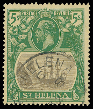 Saint Helena: 1922-37 Watermark Mult. Script CA 5s grey and green on yellow variety ‘broken mainmast’, used, one or two shortish perfs. at top, otherwise fine. S.G. 110a, cat. £1,500. Photo. (Image1)