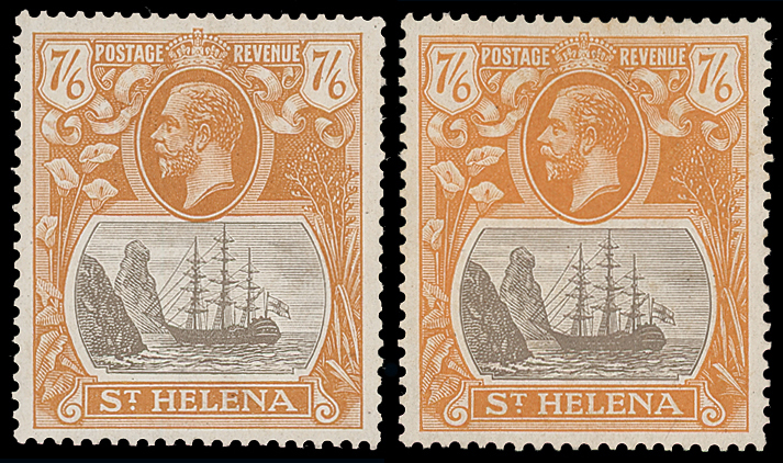 Saint Helena: 1922-37 Watermark Mult. Script CA 7s.6d. brownish grey and orange, fine mint, R.P.S. certificate (2015), also 7s.6d. grey-brown and yellow-orange B.P.A. certificate (2025). (2) S.G. 111, 111d, cat.