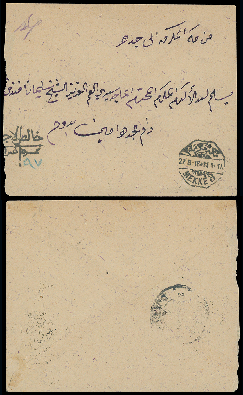 1962 c, entire, etc. imageSaudi Arabia: Ottoman Post Offices: 1916 (Nov. 6) stampless cover from Mecca to Jeddah with rare bilingual “FEE PAID” (von Uexkull type E, only recorded Nov. 1916-Mar. 1917) with despatch c.d.s and arrival backstamp. Greg Todd certificate (2016) Photo. (Image1)