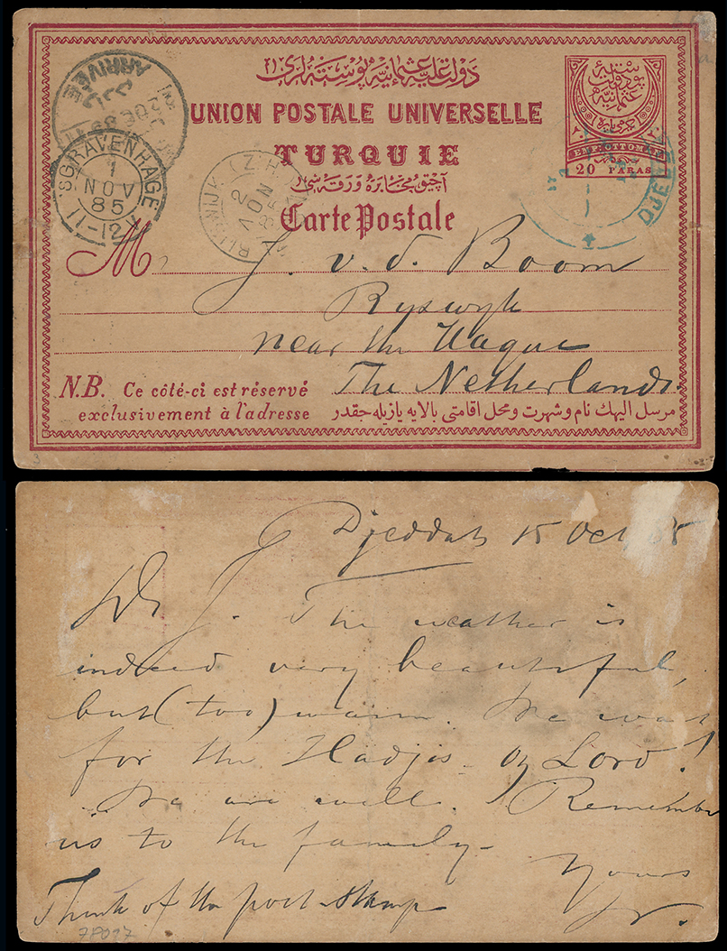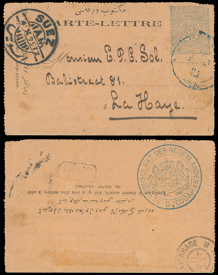 1950 c, entire, etc. imageSaudi Arabia: Ottoman Post Offices: 1895 (Oct.) Turkey postal stationery 1pi. letter card from Jeddah with fine Dutch Consulate cachet on reverse, addessed to The Hague cancelled by bilingual c.d.s. in blue with Suez transit at left and Gravenhage backstamp, slight faults but rare. Photo. (Image1)