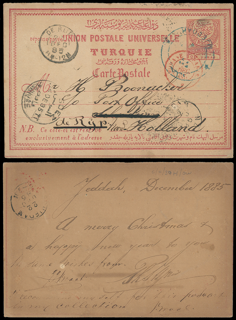 1947 c, entire, etc. imageSaudi Arabia: Ottoman Post Offices: 1885 Dec.) Turkey 20pa. postal stationery card from Jeddah to Sciedam, Netherlands and redirected to De Rijpvcancelled in blue with Suez, red Modane à Paris, Schiedam transit and arrival c.d.s’s. Photo. (Image1)
