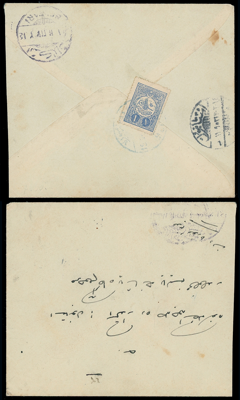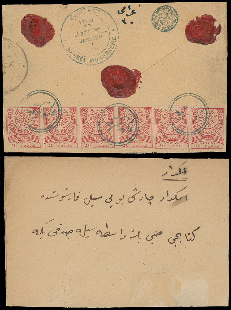 1948 c, entire, etc. imageSaudi Arabia: Ottoman Post Offices: 1890 (Jan. 7) envelope from Meccato Eskadar, slightly repaired, franked on reverse by 20pa. rose-red strip of four and two singles, one with corner damage, tied by Arabic double ring (von Uexkull type Ma) and showing registration negative seal (type Mzh) and large double ring (type Md) c.d.s. in blue, rare. Photo. (Image1)