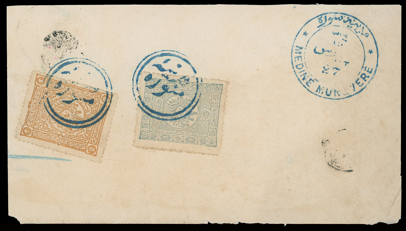 1949 On piece, front, etc. imageSaudi Arabia: Ottoman Post Offices: 1892 (Mar.) 1pi. and 2pi. tied to large price by Medina Arabic double ring in blue (von Uexkull type MDa) with large bilingual c.d.s. (type MDb) and trace of negative seal alongside. (Image1)