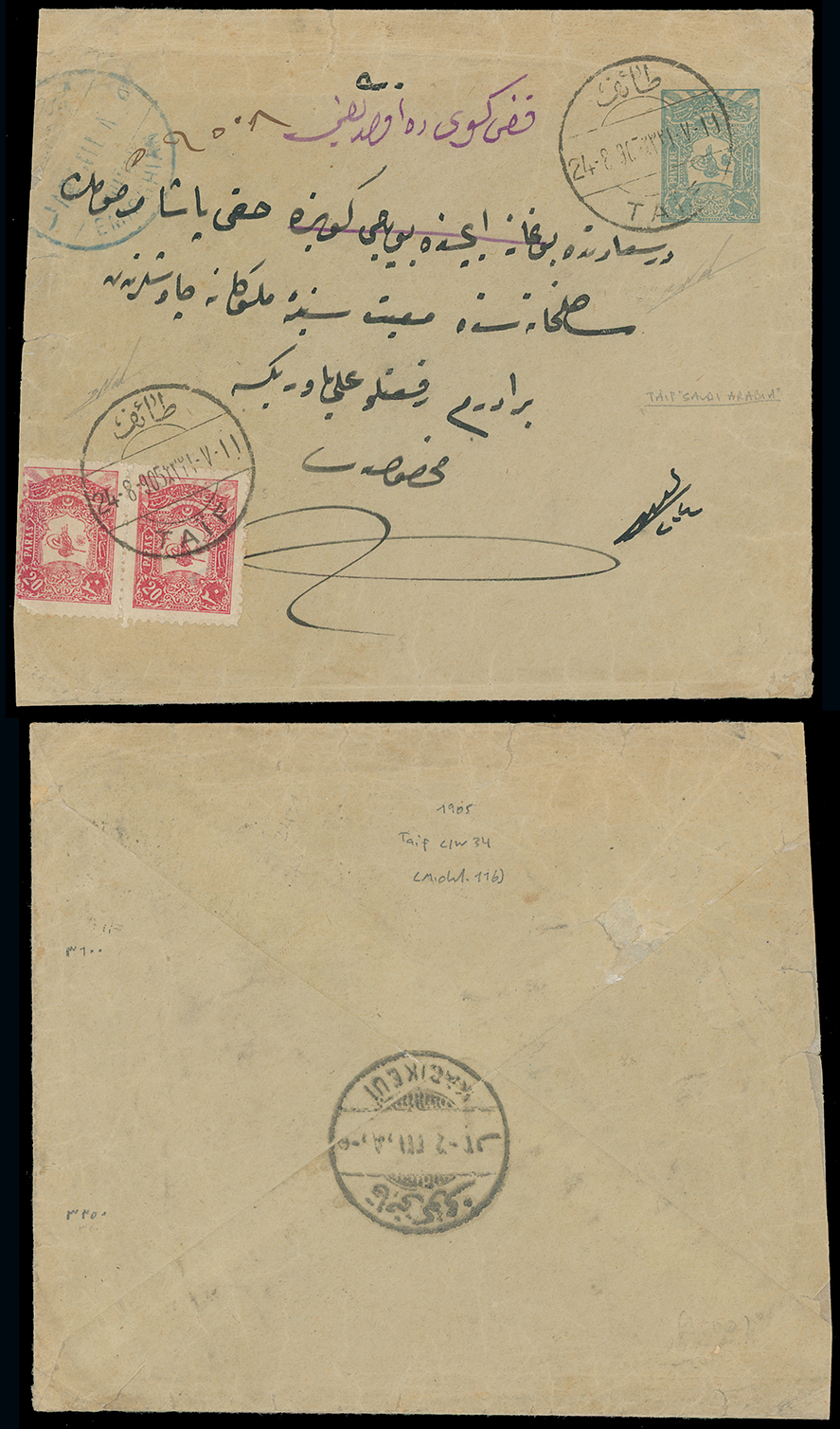 1952 c, entire, etc. imageSaudi Arabia: Ottoman Post Offices: 1905 (Aug. 24.) Turkey postal stationery 1pi. envelope, foreshortened at left, addressed to Kadi Koy uprated by 20pa. red pair, fine Taif bilingual cancellations (von Euxkull fig. 92) with Emirghian blue transit at left and arrival backstamp. Photo. (Image1)