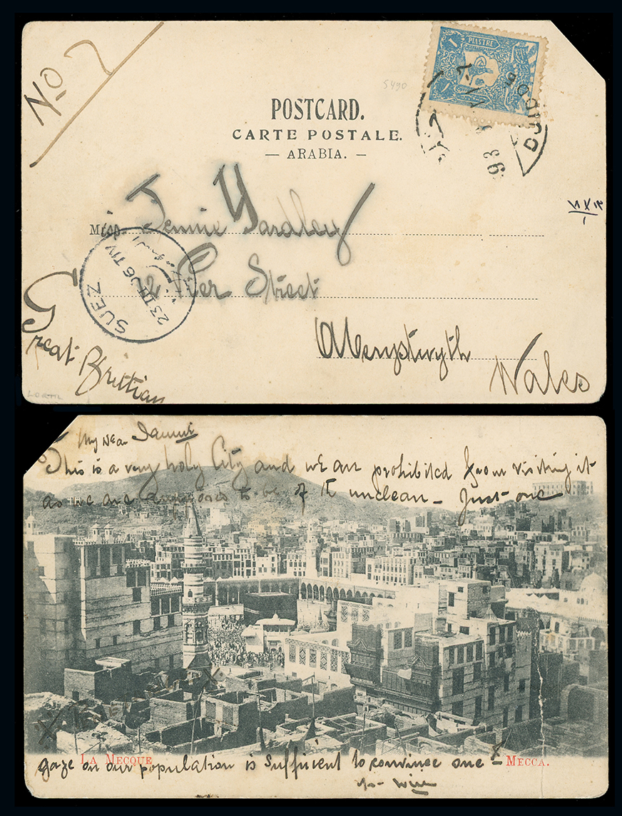 1953 c, entire, etc. imageSaudi Arabia: Ottoman Post Offices: 1905, picture postcard of Mecca sent from Jeddah to Wales franked 1pi. tied by bilingual c.d.s. with Suez transit., corner clipped. (Image1)