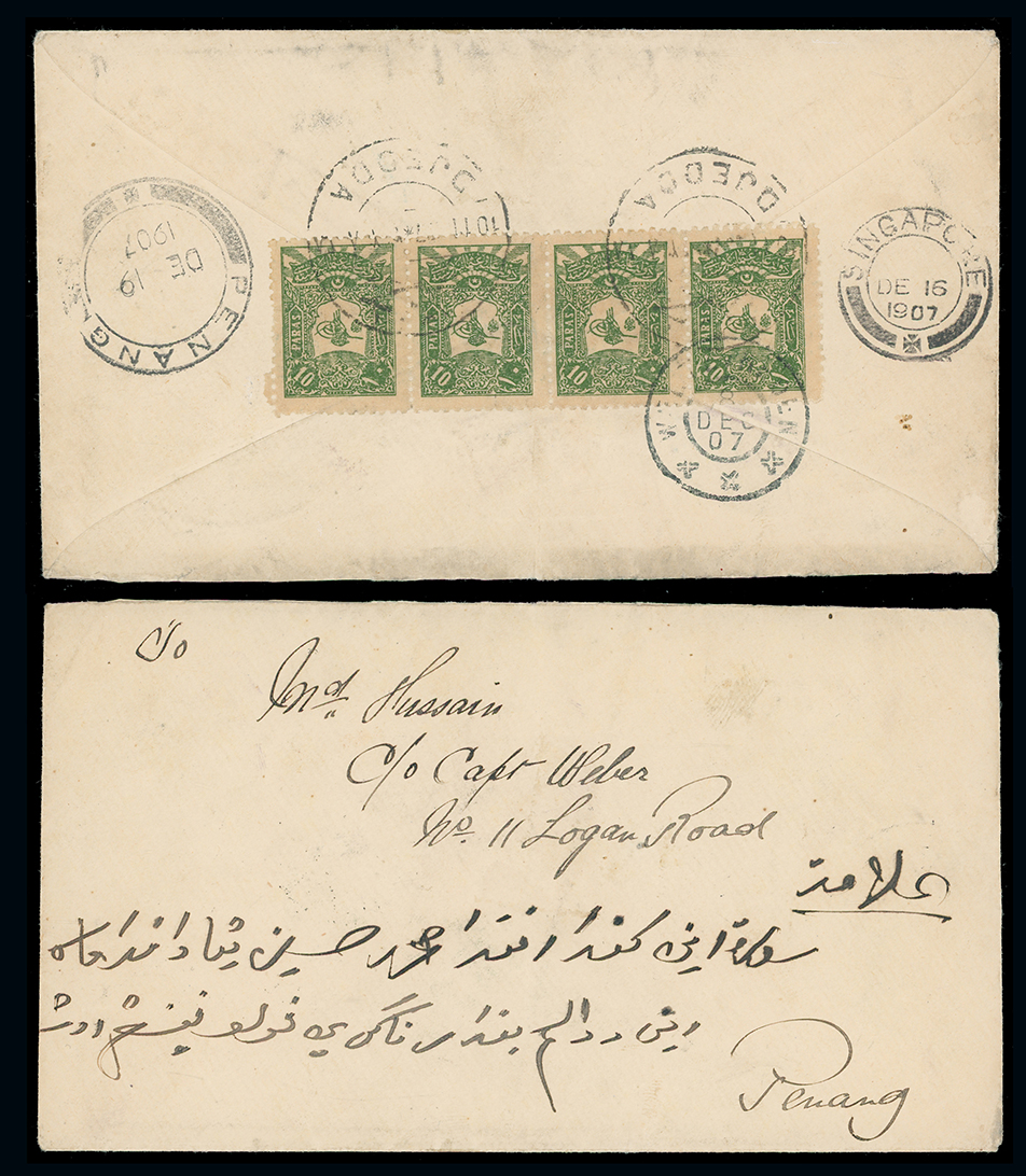 1954 c, entire, etc. imageSaudi Arabia: Ottoman Post Offices: 1905 (Nov. 10) envelope unusually to Penang franked on reverse by 10pa. green strip of four tied by Jeddah bilingual double ring c.d.s’s and Weltevreden transit with Singapore transit and Dec. 19 arrival alongside. Photo. (Image1)