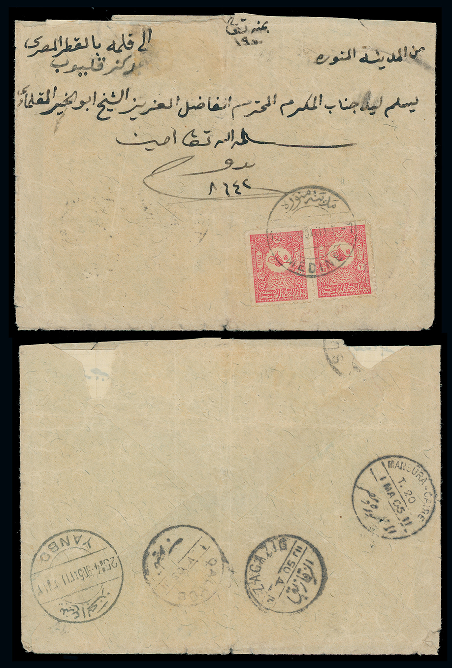1951 c, entire, etc. imageSaudi Arabia: Ottoman Post Offices: 1905 envelope from Medina to Egypt franked 20pa red pair tied by Medina c.d.s., some creasing and slightly trimmed at top but enclosing original letter, showing on reverse transit marks, incl. Yanbo El Bahr (Coles & Walker type 37). Photo. (Image1)
