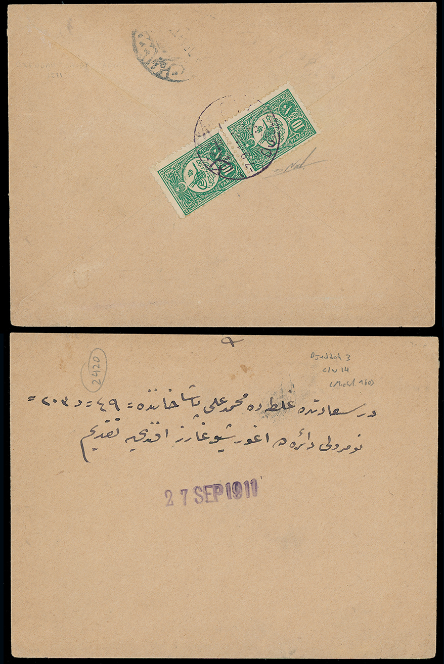 1957 c, entire, etc. imageSaudi Arabia: Ottoman Post Offices: 1911 (Sept. 7) envelope from Jeddah to Constantinople franked on reverse by 10pa. green vertical pair tied by Jeddah bilingual c.d.s. (this the earliest known date for Coles & Walker type 14), straight line arrival on obverse. Photo. (Image1)