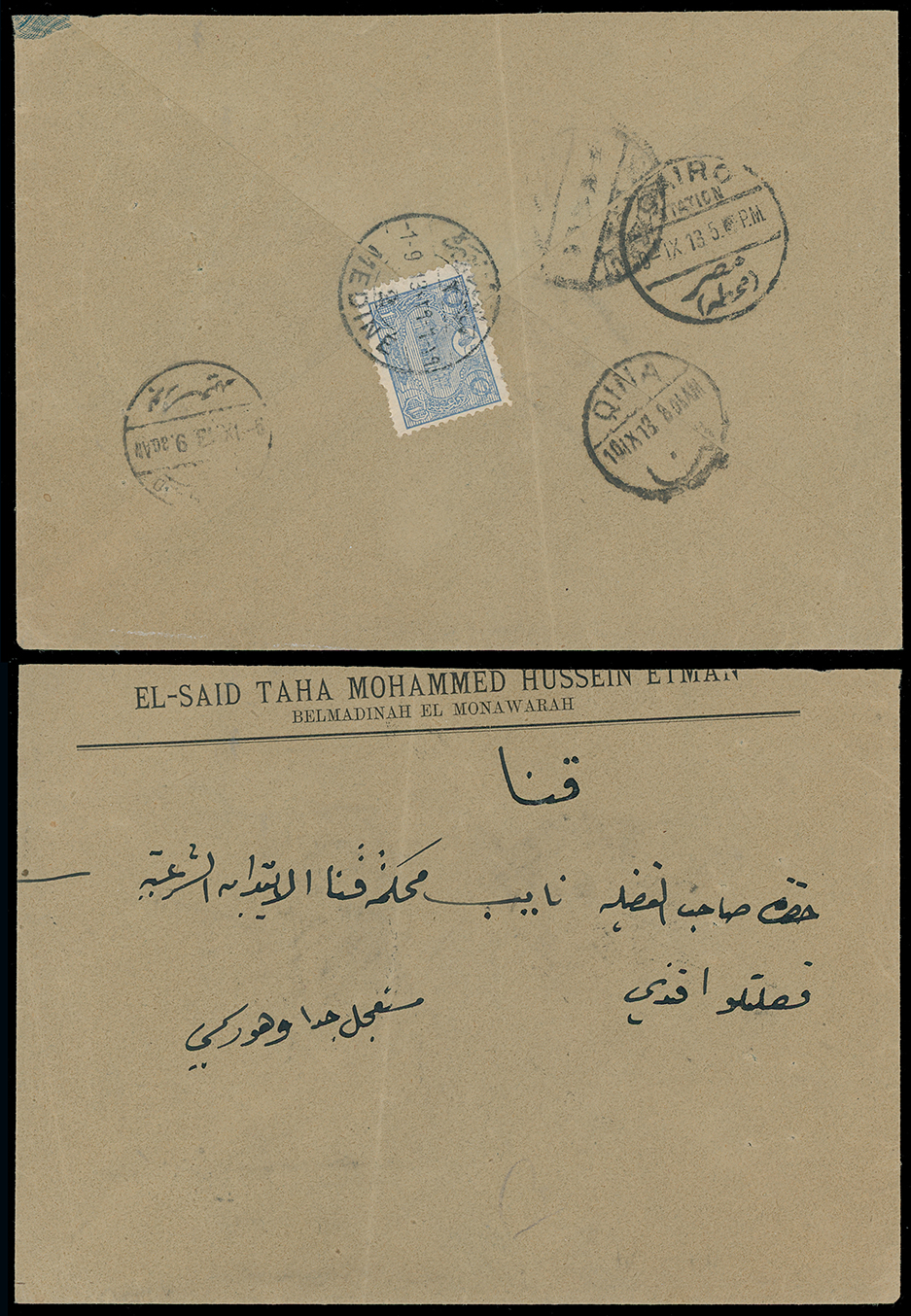 1958 c, entire, etc. imageSaudi Arabia: Ottoman Post Offices: 1913 (Sept. 1) envelope from Medina to Qina, Egypt franked on reverse by 1pi. blue tied by fine Medina bilingual c.d.s. (Coles & Walker type 31, in use for one year only), with transit marks of Cairo, Port Said, and Qina Sept. 10 arrival, slightly trimmed at top. Photo. (Image1)