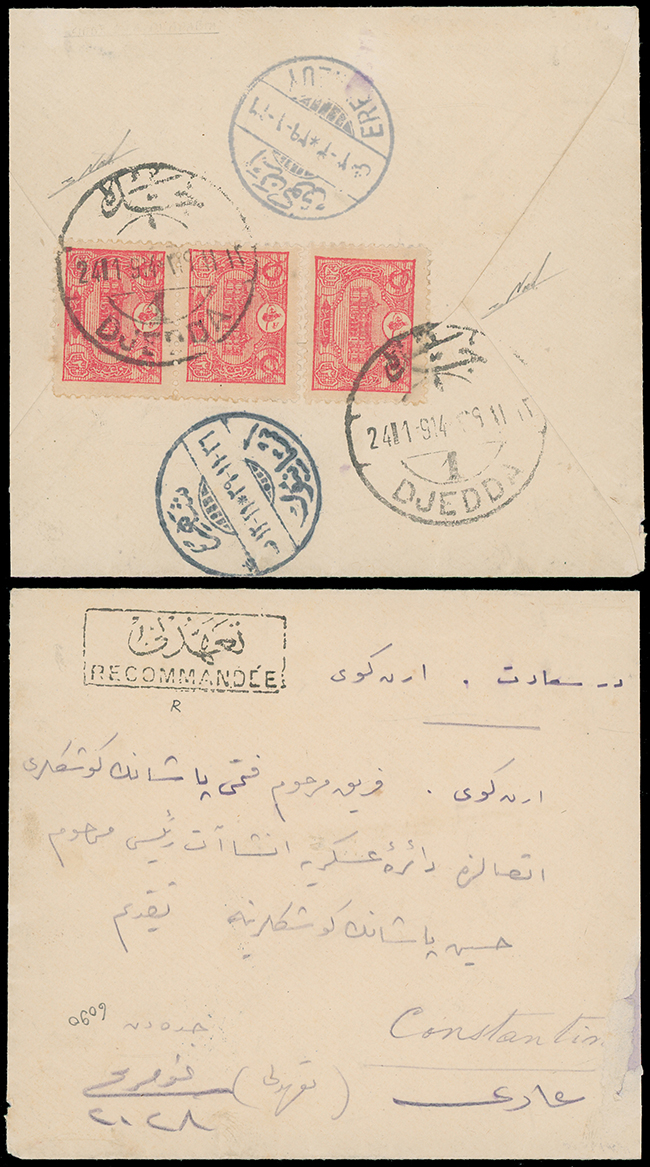 1959 c, entire, etc. imageSaudi Arabia: Ottoman Post Offices: 1914 (Jan. 24) envelope, foreshortened at right, from Jeddah to Eren Keuy, Istanbul bearing on reverse 20pa. carmine-rose pair and single tied by large bilingual c.d.s. (Coles & Walker type 13) with Eren Keuy arrival and showing fine impression boxed “RECOMMANDÉE” for official and miltary mail unrecorded by von Uexkull. Photo. (Image1)