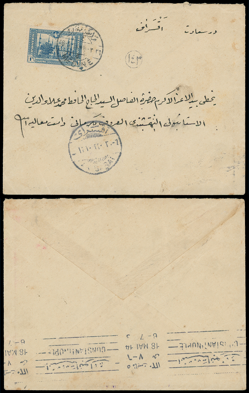 1960 c, entire, etc. imageSaudi Arabia: Ottoman Post Offices: 1914 (May 16) envelope from Medina to Aqsaray in Turkey franked 1pi. blue, tied by Medina/4 c.d.s. with Constantinople May 18 machine arrival on reverse. Photo. (Image1)