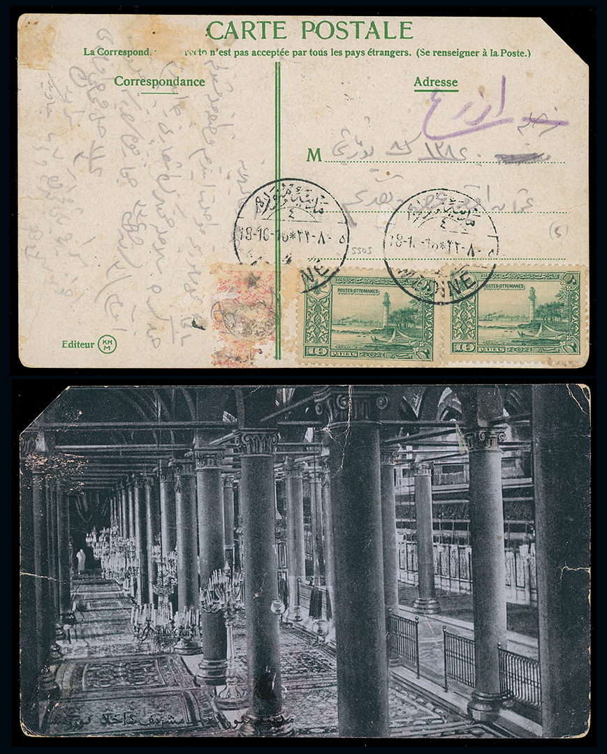 1963 c, entire, etc. imageSaudi Arabia: Ottoman Post Offices: 1918 (Oct. 18) picture postcard from Medina to Ezraa, Syria) franked by 10pa. green (2) and 20pa. (largely removed) tied by Medina/4 bilingual c.d.s’s, corner clipped. (Image1)