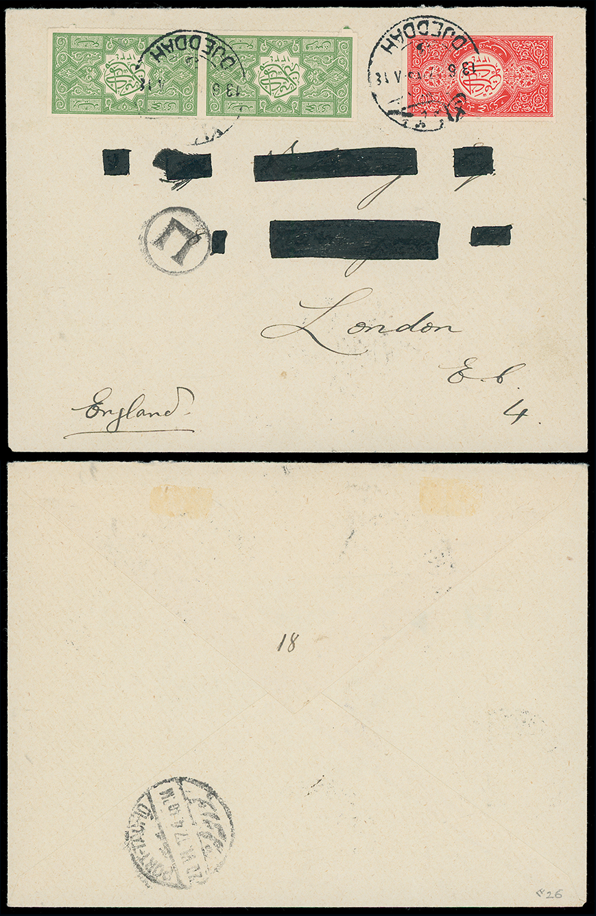 1964 c, entire, etc. imageSaudi Arabia: Hejaz: 1917 (May 31) envelope from Jeddah to London, address part obscured, franked by 1916-17 rouletted 1/4pi. green pair and 1/2pi. red tied by bilingual c.d.s. with censor mark below, Port-Taufiq June 20 transit on reverse. (Image1)