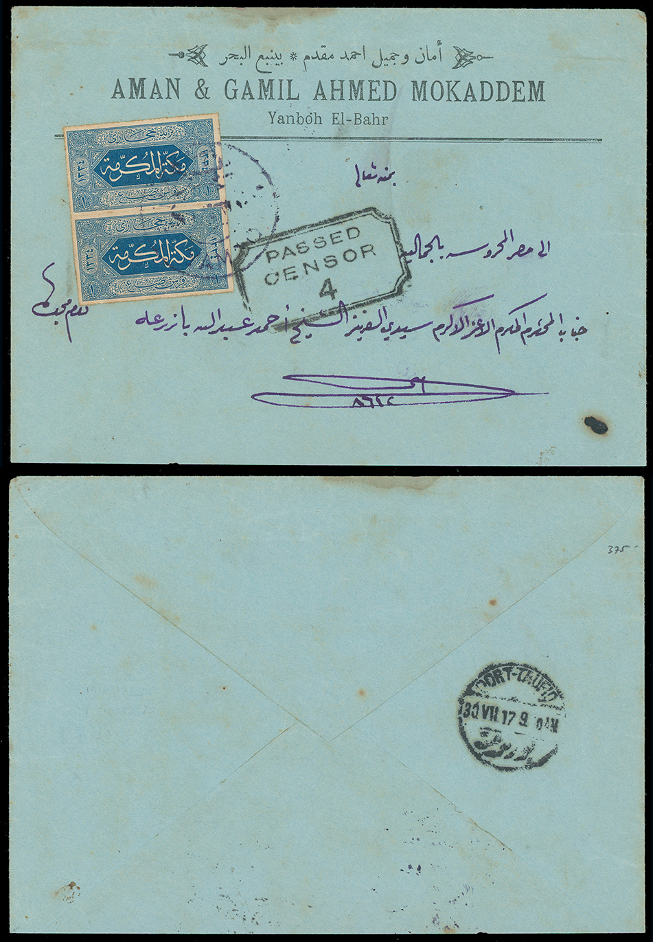 1965 c, entire, etc. imageSaudi Arabia: Hejaz: 1917 (July 23) commercial cover to Cairo franked by 1916-17 rouletted 1pi. blue tied by Yambo double circle c.d.s. with fine strike of framed “PASSED/CENSOR/4” alongside, backstamped Port-Taufiq July 30 transit on reverse. (Image1)
