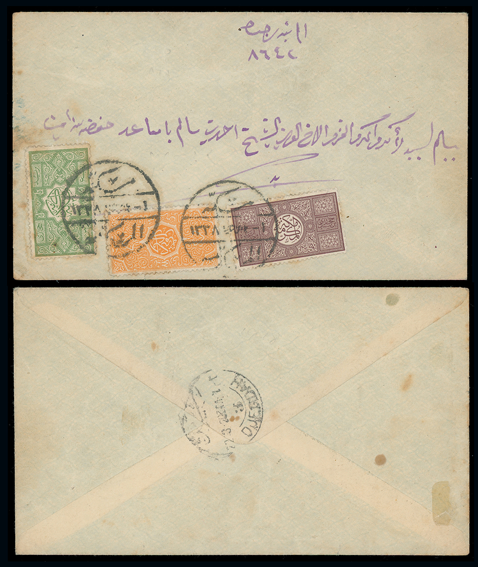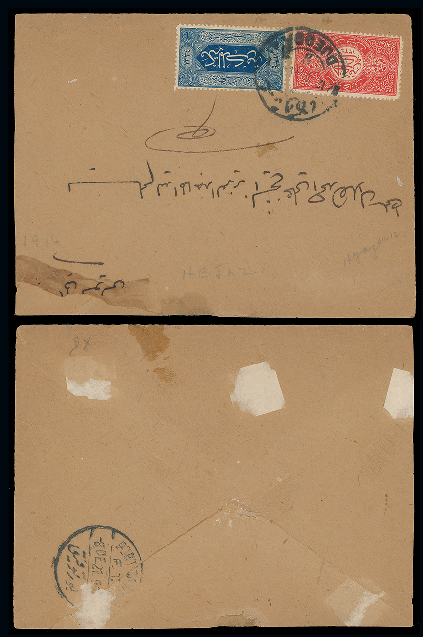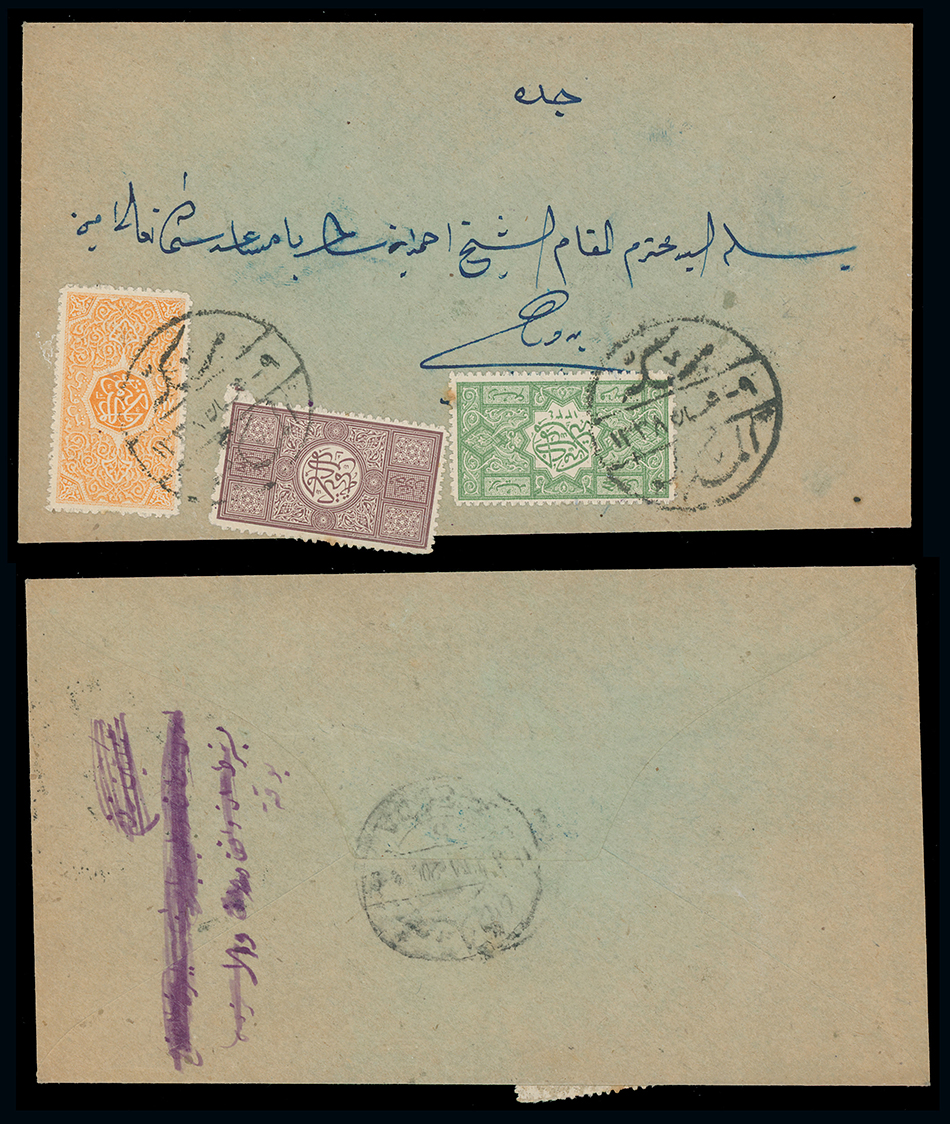 1966 c, entire, etc. imageSaudi Arabia: Hejaz: 1920 internal cover from Mecca to Jeddah bearing 1917 zig-zag roulette 1pa., 1/8pi. and 1/4pi .tied by Mecca Mukarama c.d.s’s with arrival on reverse, slight staining but attractive. (Image1)