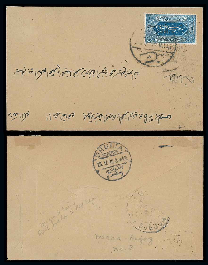 1967 c, entire, etc. imageSaudi Arabia: Hejaz: 1920 envelope from Mecca to Egypt bearing 1917 zig-zag roulette 1pi. blue tied tied by Mecca Mukarama c.d.s’s with Jeddah transit and Ghuria May 28 arrival on reverse. (Image1)