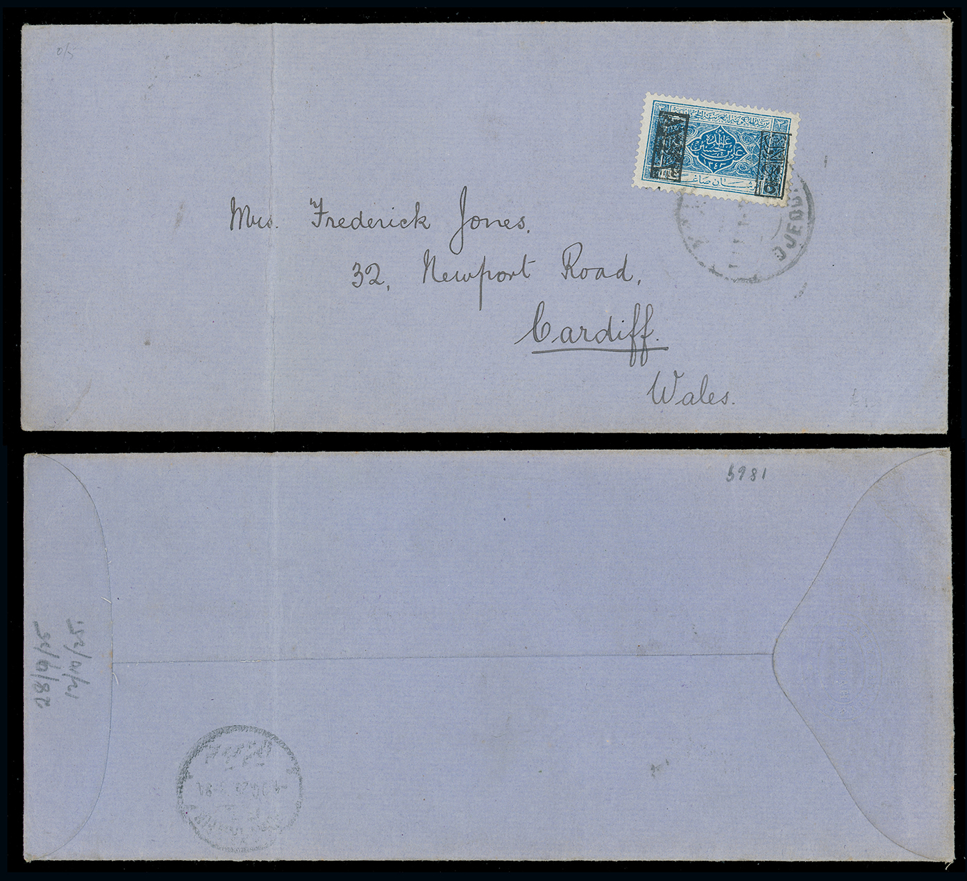 1970 c, entire, etc. imageSaudi Arabia: Hejaz: 1925 (Sept. 28) Gellatly, Hankey and Co. blue legal envelope from Jeddah to Cardiff, vertical fold at left, franked by (June) type 24 Jeddah overprint in black 2pi. blue tied by double ring c.d.s. with faint Port-Taufiq transit on reverse. (Image1)