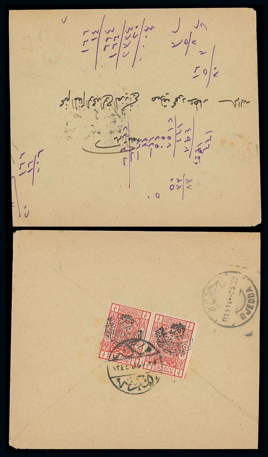 1971 c, entire, etc. imageSaudi Arabia: Nejdi Occupation of Hejaz: 1926 envelope from Mecca to Jeddah, slightly trimmed at right, franked on reverse by 1925 (July-Aug.) ‘Nejd Sultanate Post’ in black on 1922-24 1/2pi. scarlet pair, tied by Mecca Mukarama c.d.s. with arrival alongside. Photo. (Image1)