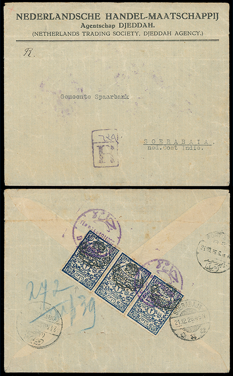 1972 c, entire, etc. imageSaudi Arabia: Nejdi Occupation of Hejaz: 1926 (Nov. 19) Nederlandsche Handel-Maatcshappij envelope registered from Jeddah to Soerabaja, Dutch East Indies, bearing on reverse 1925 (July-Aug.) ‘Nejd Sultanate Post’ in black on Notarial 2pi. blue scarce strip of three tied by purple Jeddah c.d.s. and Soerabaja Dec. 21 arrival, boxed “R” on obverse, some creasing, rare destination. Photo. (Image1)