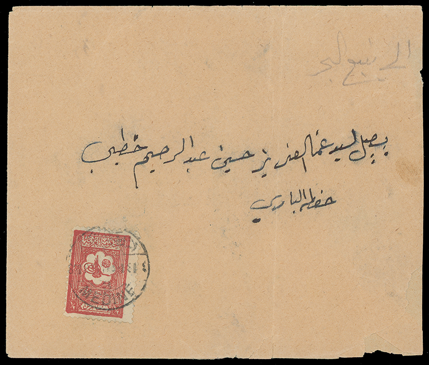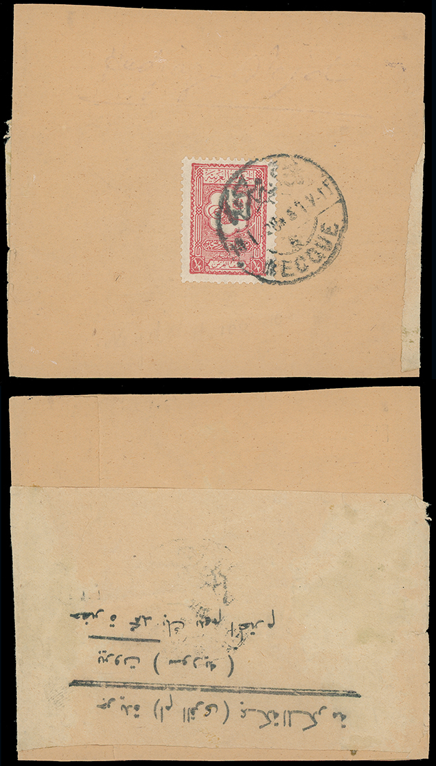 1974 On piece, front, etc. imageSaudi Arabia: Hejaz and Nejd: 1928 (Jan. 14) newspaper wrapper to Beirut franked by 1927 (Jan.)1/2pi. red tied by bilingual Mecque c.d.s., very scarce. (Image1)