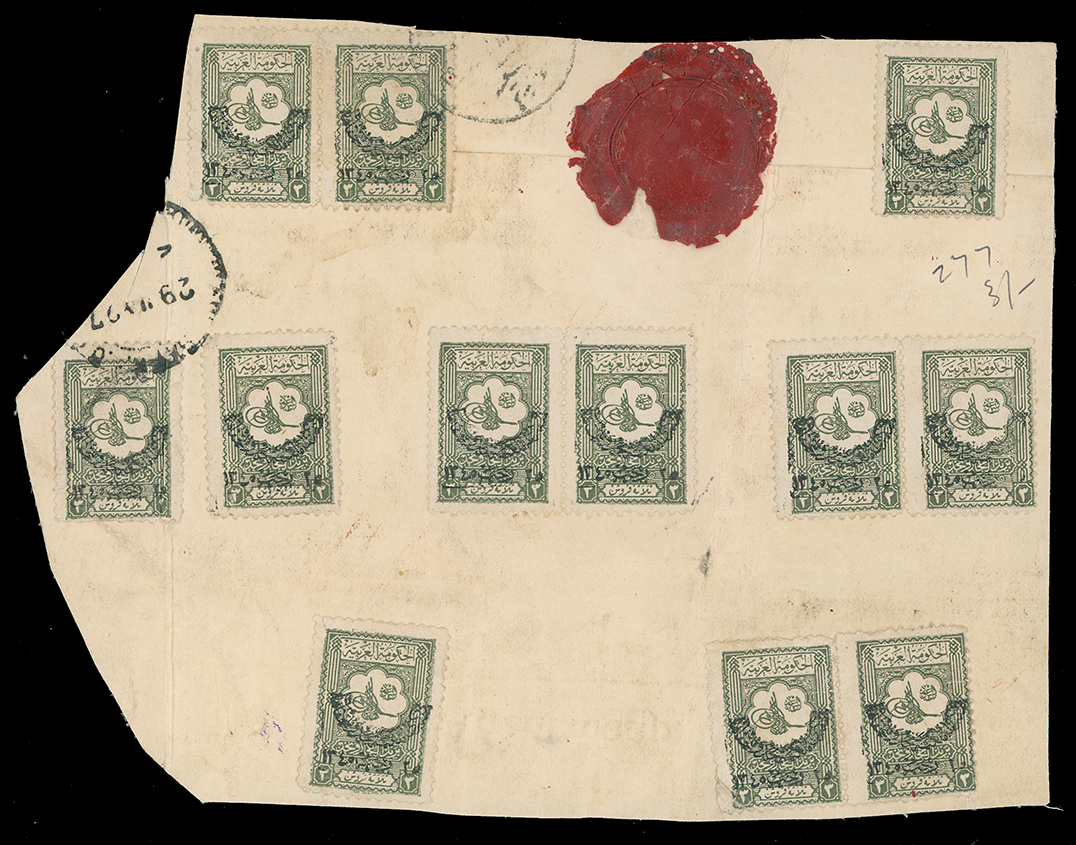 1975 On piece, front, etc. imageSaudi Arabia: Hejaz and Nejd: 1927 large piece from parcel wrapping bearing 1927 (Jan.) Establishment of Kingdom overprint in black on 3pi. olive-green (12, two tied) with Nederlandsche Handel-Maatcshappij red wax seal. (Image1)