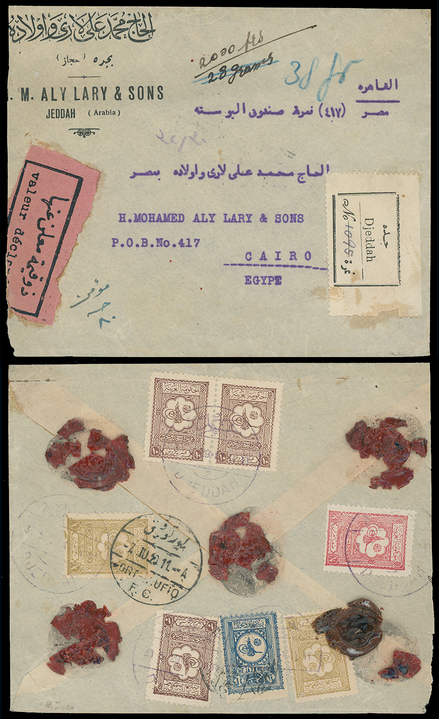 1976 On piece, front, etc. imageSaudi Arabia: Hejaz and Nejd: 1929 (May 31) envelope registered from Jeddah to Cairo with registration and pink Valeur Declarée labels, franked on reverse by 1927 (Jan.) 1/4pi. sage-green (2), 1/2pi. red, 10pi. chocolate (3, incl. a pair) and New Currency 13/4g. blue tied by purple c.d.s’s and Port-Taufiq June 7 transit, slightly trimmed at left. Photo. (Image1)