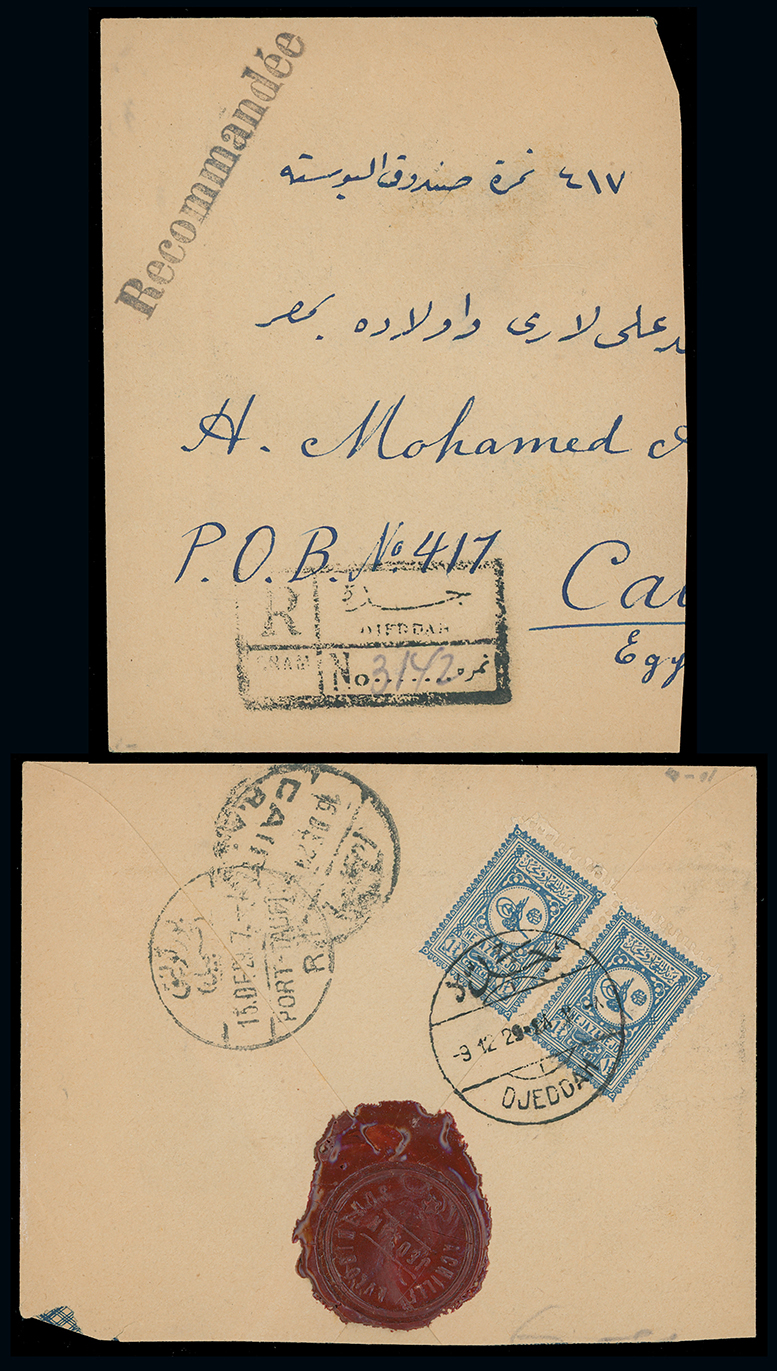 1977 c, entire, etc. imageSaudi Arabia: Hejaz and Nejd: 1929 (Dec. 6) large part registered cover from Jeddah to Cairo with boxed and straight line franked registration markings, franked on reverse by 13/4g. blue pair tied by fine c.d.s. with Achille Evlogimlaos red wax seal, transit and arrival datestamps alongside. (Image1)