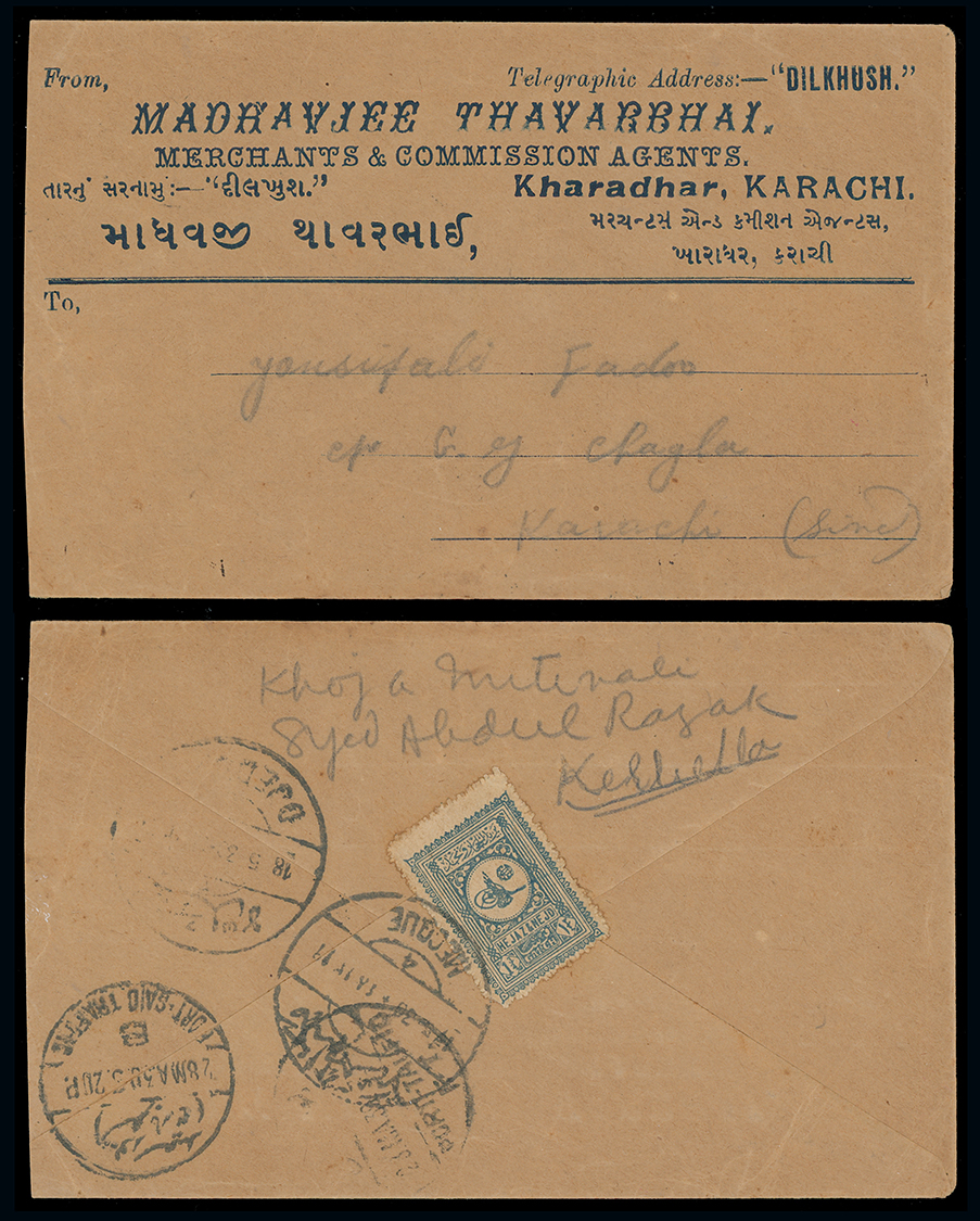 1978 c, entire, etc. imageSaudi Arabia: Hejaz and Nejd: 1930 (May 17) envelope from Mecca to Karachi via Jeddah franked by 1929 13/4g. blue tied by Mecque c.d.s. with transit datestamps alongside, very slightly trimmed at left. (Image1)