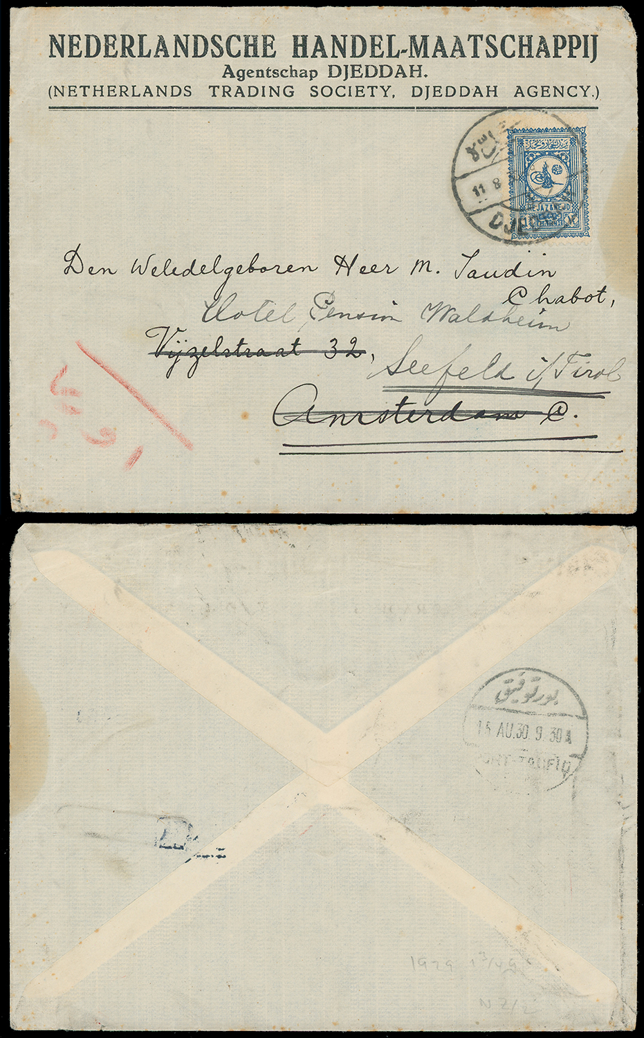 1979 c, entire, etc. imageSaudi Arabia: Hejaz and Nejd: 1930 (Aug. 11) Nederlandsche Handel-Maatcshappij envelope to Amsterdam, redirected to Seefeld, Austria franked by 1929 13/4g. blue tied by Jeddah double circle c.d.s., Port-Taufiq transit on reverse. (Image1)