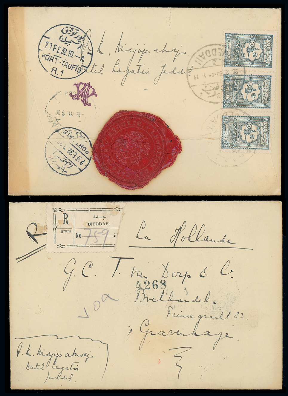 1981 c, entire, etc. imageSaudi Arabia: Hejaz and Nejd: 1932 (Feb. 26) registered cover from Jeddah to The Hague with registration label, franked on reverse by 1927 (Jan.) 11/2pi. strip of three (one with fault)) tied by double circles with large red wax seal of the Légation des Pays-Bas in Jeddah and transit datestamps alongside. Photo. (Image1)