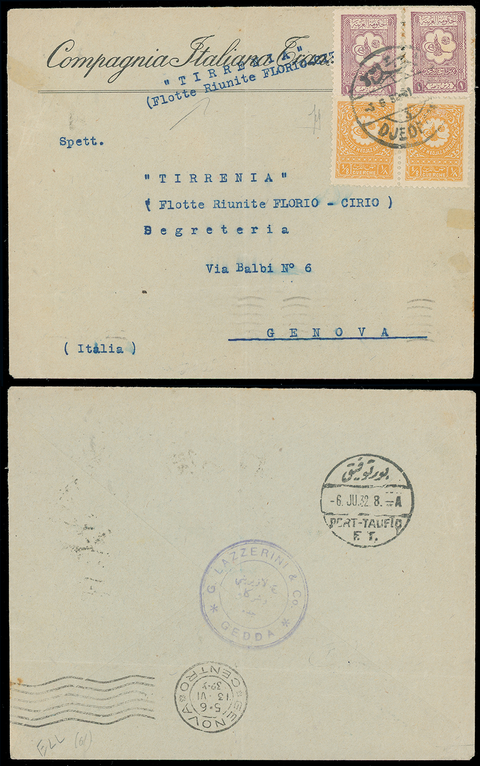 1982 c, entire, etc. imageSaudi Arabia: Hejaz and Nejd: 1932 (May 3) attractive envelope to Genoa bearing 1927 (Jan, 1pi. purple (2) and 1931-32 1/8g. yellow pair cancelled by Jeddah double ring, backstamped Port-Taufiq transit and June 13 arrival. Photo. (Image1)