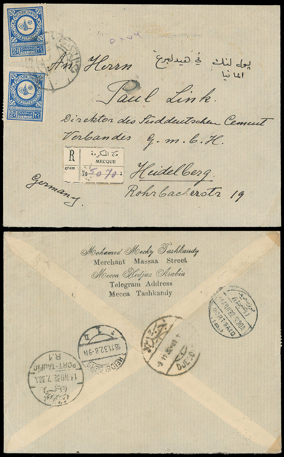 1980 c, entire, etc. imageSaudi Arabia: Hejaz and Nejd: 1932 envelope to Germany franked 1932 21/4g. blue (2) tied by Mecca c.d.s. with registration label, backstamped Jeddah, Port Said, Port Taufiq and Heidelberg Nov. 18 arrival. (Image1)